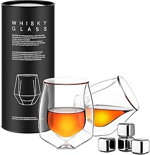 ウイスキーグラス 2個セット ウイスキーストーン付き 手吹き二重壁ガラス バーボングラス 完璧なカクテル スコッチ ギフトボックス付き 父の日 ウェディングバーセット クリスマスギフト(ブラック)