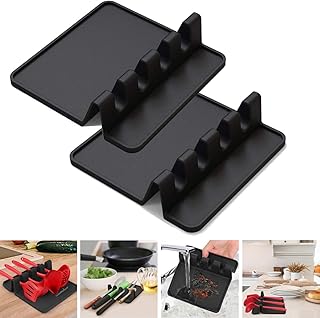 シリコンテーブルウェアラックレスト 耐熱キッチン用品ラック ドリップパッド付き マルチスプーンラック コンロトップ スパチュラ スプーン トング用 (ブラック2個)